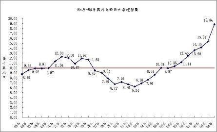 不應全用歐美臨床精神醫療 台灣甚至亞洲各國的自殺防治方向可能都錯了。一項台灣和香港聯手的研究發現,歐美國家自殺者九成以上患有憂鬱症等精神官能症,亞洲地區自殺者卻只有五、六成有精神疾患,加上東西方文化不同,不應全盤採用歐美國家偏重臨床的精神醫療。 這項研究因提出前所未有的全新觀點,備受矚目,論文已被國際頂尖醫學期刊「刺胳針」 (Lancet)接受刊登。第一作者是台北立聯合醫院松德院區一般精神科主治醫師陳映燁,第二作者則是香港大學自殺防治中心總監、社會工作系教授葉兆輝。 隨著經濟起飛,近年來亞洲自殺人口明顯增加。陳映燁發現,西方精神科治療有相當程度的個人主義色彩,精神科醫師通常會鼓勵病人勇於對自己負責,盡可能自己解決問題。和亞洲國家重視和諧、團體和社群主義的儒家哲學思維不同。 台灣自殺率 十年來增加三倍